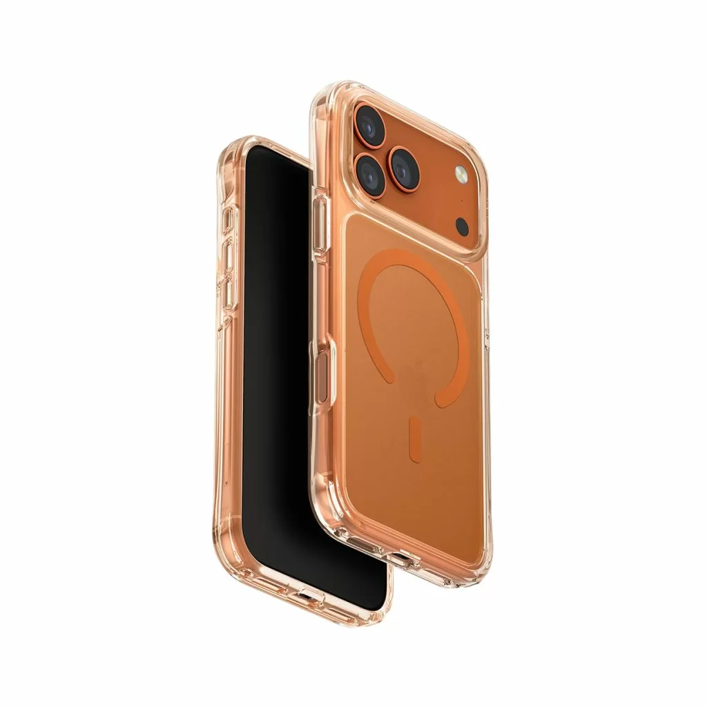 Лёгкий и надёжный аксессуар, идеально адаптированный к формам iPhone 17 Pro Max: MagSafe обеспечивает мгновенную и стабильную фиксацию, а продуманная многослойная конструкция бережно гасит удары и царапины. Внутренняя мягкая подкладка заботится о корпусе, а оттенок Clear/Volt Orange добавляет глубину цвета и приятные тактильные ощущения при каждом касании. Сохранён свободный доступ к камерам и элементам управления, а беспроводная зарядка работает без необходимости снимать аксессуар — всё для вашего смартфона и удобства использования.