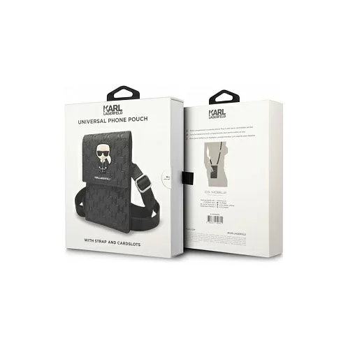 Удобная и эффектная сумка-чехол для мобильного телефона, выполненная из прочной искусственной кожи с символикой дома моды Karl Lagerfeld. На откидной крышке сумки размещено фирменное изображение дизайнера или логотипа (в зависимости от модели). Закрывается крышка при помощи магнитной застежки.