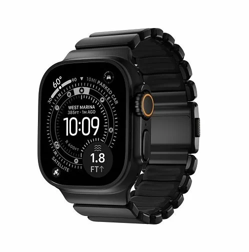 Ремешок Nomad Stratos объединяет несочетаемое: внешний каркас звеньев отлит из титана Grade 4, а внутренняя часть выполнена из мягкого фторэластомера (FKM). Титан Grade 4 значительно прочнее стандартных сплавов, используемых в аксессуарах, а специальное DLC-покрытие защищает поверхность металла от царапин и потертостей, сохраняя премиальный вид даже при жесткой эксплуатации.