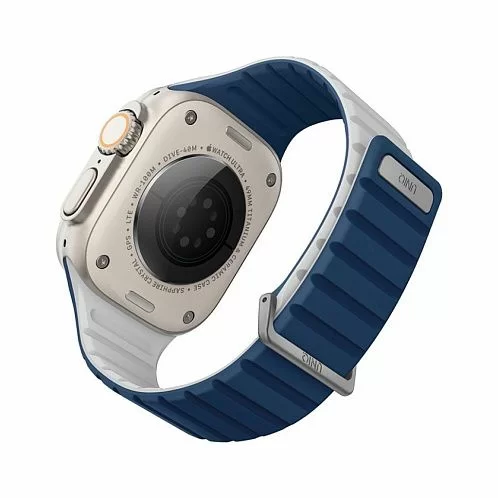 Двусторонний ремешок из мягкого силикона Uniq REVIX EVO для Apple Watch с размером корпуса 49-46-45-44. Вы можете легко поменять внешние стороны ремешка в зависимости от своего стиля и предпочтений. Фиксируется на руке с помощью удобной магнитной застежки, выдерживает нагрузку до 1.2 кг. Возможность регулировки длины за счет встроенных магнитов обеспечивает точное соответствие размерам руки. Металлическая стальная застежка дополнительно фиксирует устройство на запястье, позволяя не беспокоиться об утере даже при занятиях спортом.
