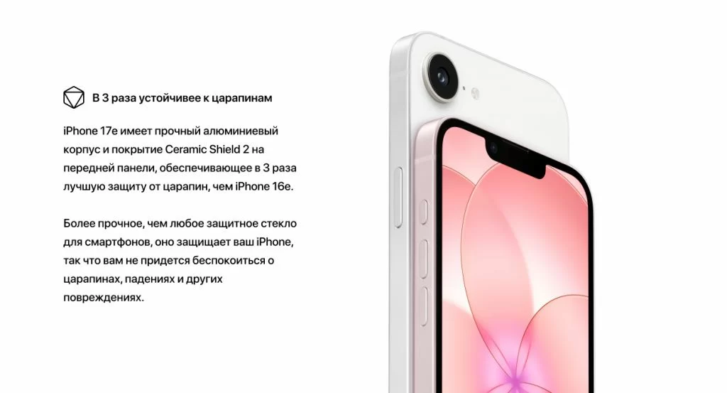 Алюминиевый корпус iPhone 17e получил фронтальное стекло Ceramic Shield 2 — новое поколение материала, который Apple разработала совместно с Corning. По данным компании, устойчивость к царапинам выросла втрое по сравнению с iPhone 16e: не в теории, а по результатам физических тестов на твёрдость поверхности. Это первый раз, когда Ceramic Shield второго поколения появился в e-серии.