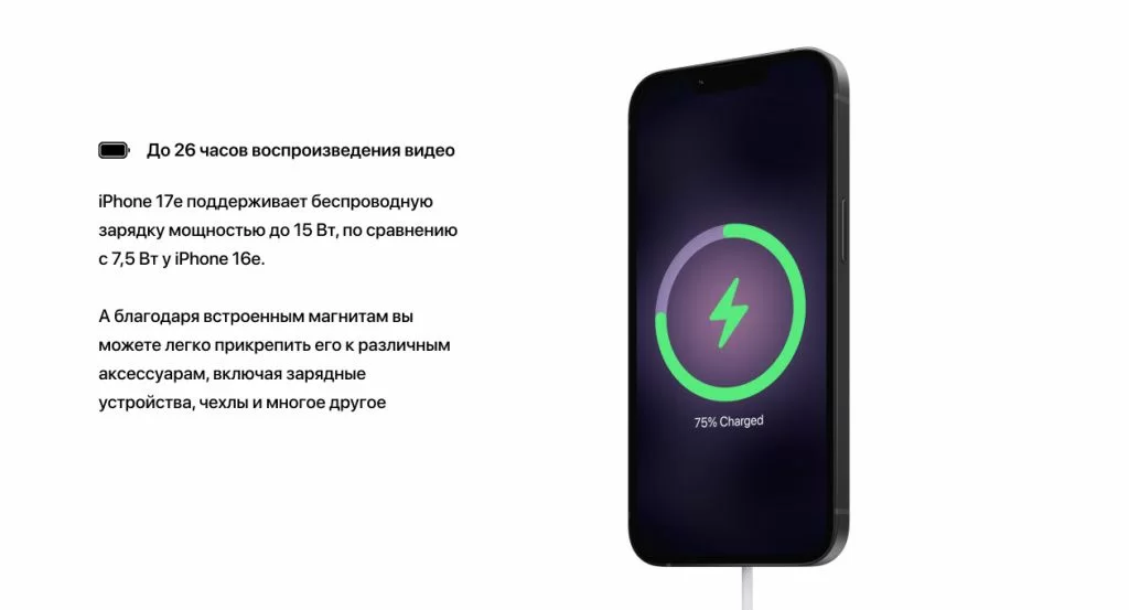 До 26 часов воспроизведения видео — на четыре часа больше, чем у iPhone 16e. Это существенный прирост, который ощущается в реальном использовании: смартфон спокойно переживает насыщенный день с навигацией, соцсетями и звонками.