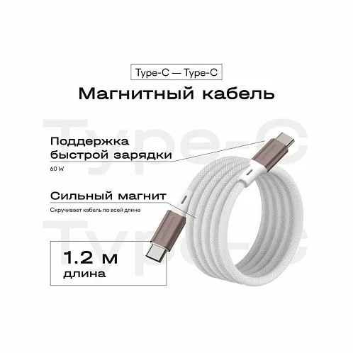 Магнитная конструкция позволяет легко и удобно подключать кабель без лишних усилий. Благодаря магнитам, кабель легко скручивается без заломов и спутывания. Магнитный кабель защищает гаджеты от случайных повреждений при непреднамеренном рывке или перегибе. Длина 1.2 метра обеспечивает комфорт при использовании. Кабель подходит для любых устройств с разъёмом USB-C.