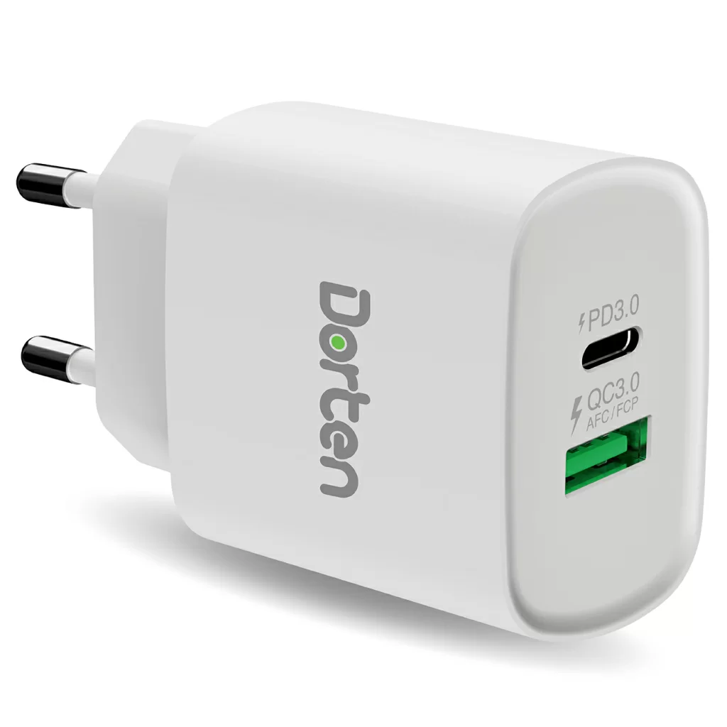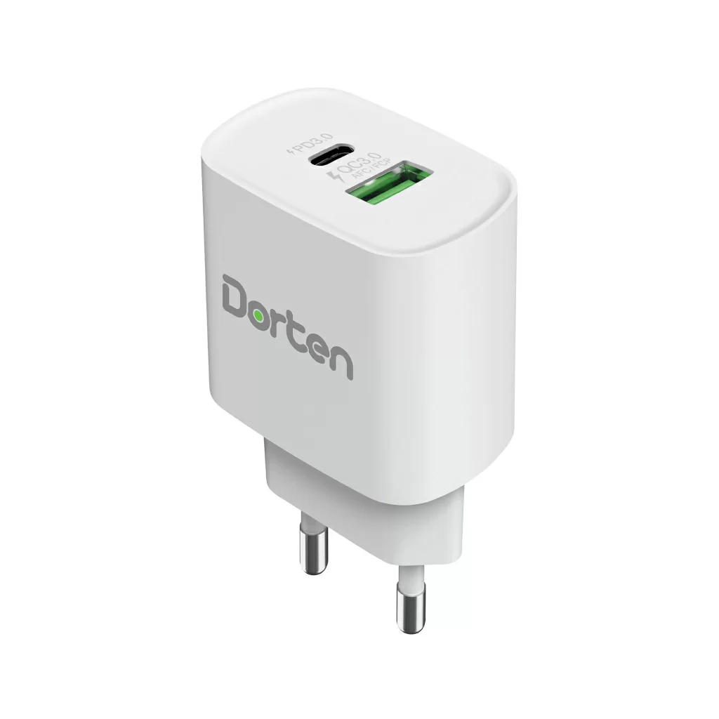 Блок питания Dorten позволяет заряжать устройства с помощью портов USB-C и USB-A. Оба порта соединены с внутренним чипсетом, который автоматически определяет подключенное устройство, чтобы обеспечить нужное количество энергии для оптимальной зарядки. USB-C мощностью 20 Вт с технологией PD3.0 обеспечивает быструю зарядку вашего смартфона Айфон / планшета Apple (до 50% емкости аккумулятора можно зарядить в течение 30 минут), в то время как 18-ваттный порт USB-A, поддерживающий Qualcomm ™ 3.0, FCP ™ и AFC ™ одновременно, так же обеспечивает быструю зарядку вашего смартфона / планшета (в течение 20 минут можно зарядить до 50% емкости аккумулятора).