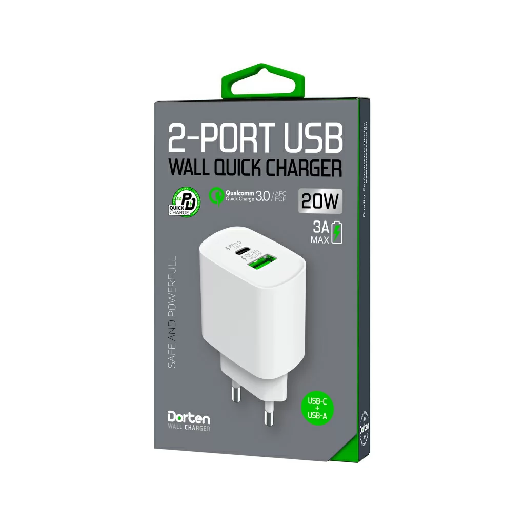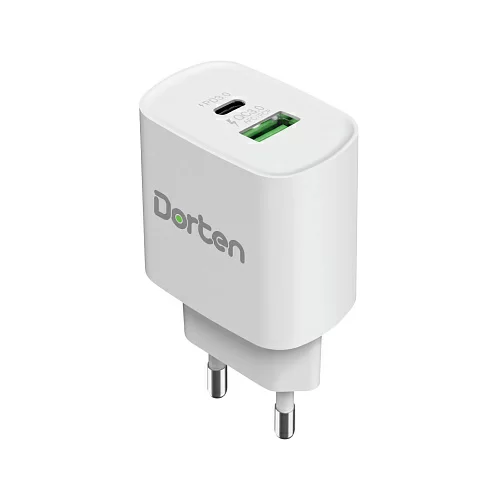 Сетевое зарядное устройство Dorten 2-Port USB 20W Wall Quick Charger PD3.0+QC3.0, белый