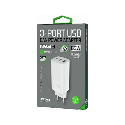 Сетевое зарядное устройство Dorten 3-Port USB Smart ID 65W GaN Power Adapter, белый