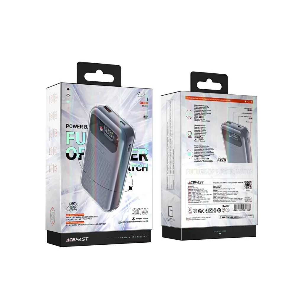 ACEFAST Sparkling series 30W fast charging Power Bank — внешний аккумулятор высокой ёмкости с долгим периодом сохранения заряда. В вашем распоряжении 1 стандартный USB порт и 1 USB Type-C порт для зарядки ваших гаджетов. Максимальная мощность составляет 30 Ватт (USB-C). Аккумулятор поддерживает технологии быстрой зарядки, такие как: PD2.0, PD3.0, PPS, QC3.0/QC2.0, QC4+, SCP.