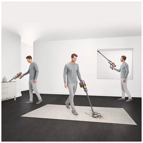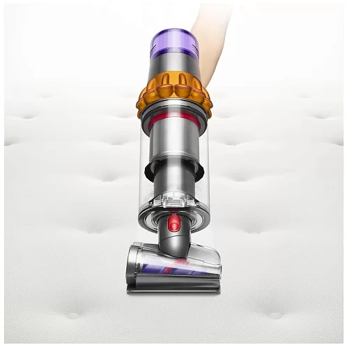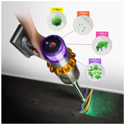 Модель оснащена циклонным фильтром, что обеспечивает простоту и удобство применения. Изделие отделяет частицы пыли, шерсть, волосы и мелкий бытовой сор от воздушного потока. Это повышает качество уборки, а также облегчает дыхание членов семьи. Специальная система извлечения мусора позволяет пользователю с легкостью освобождать контейнер. Для поддержания чистоты фильтр и насадку можно мыть в проточной воде. Вертикальный пылесос Dyson V15 Detect оснащен управлением электронного типа с дисплеем.