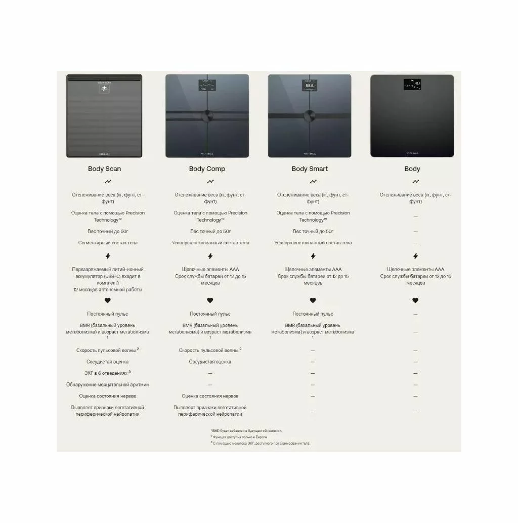 Body Comp обеспечивает наиболее полную оценку, когда-либо предлагавшуюся на интеллектуальных весах Withings, с расширенным составом тела, эксклюзивной информацией о сердечно-сосудистой системе и оценкой состояния нервов, помогающей выявлять признаки периферической невропатии.