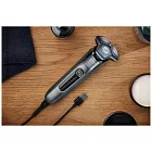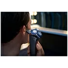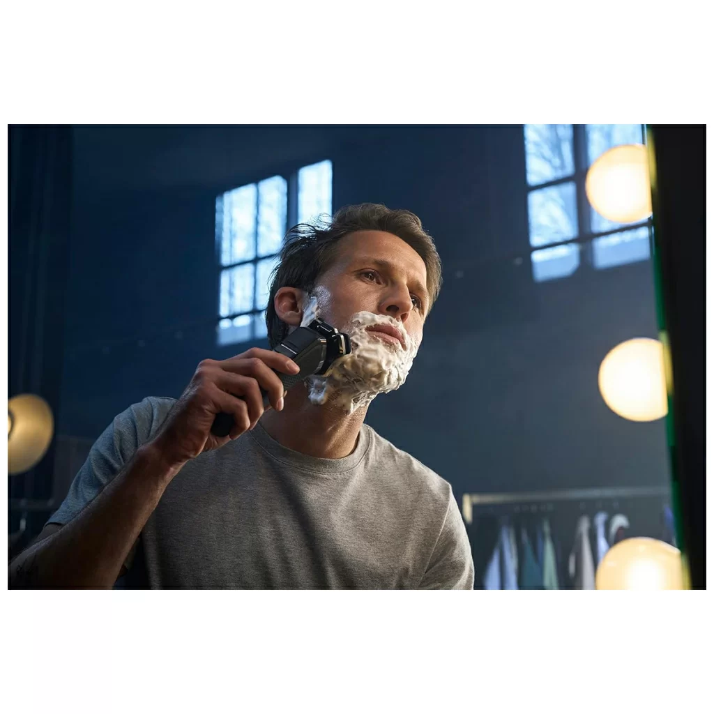 Электробритва двойного назначения для сухого и влажного бритья. Нож изготовлен с использованием технологии SenselQ, есть выдвижной триммер с 250000 микротехническими шариками на квадратный сантиметр и покрытие Nano SkinGlide, которое дает эффект плавного скольжения по коже, чтобы уменьшить раздражение. Каждую минуту бритва производит до 90000 движений, а 45 высокопроизводительных лезвий SteelPrecision сбривают больше волос. Интеллектуальный датчик волос на лице читает 250 раз в секунду и автоматически адаптирует движение к контурам лица.